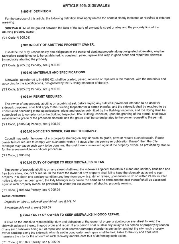 City Code § 905.06 – Duty of Owner to Keep Sidewalks Clean – requires that the owner of property abutting any street maintain the sidewalk in a clean and sanitary condition and free from snow, ice, dirt, or refuse.